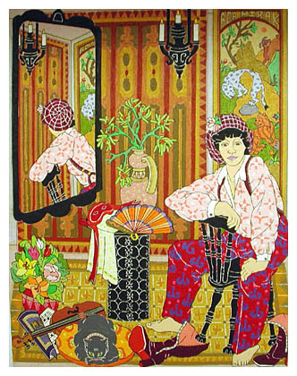 Title: Woman in Checkered Cap Medium: Acrylic with Mixed Media on Wood Frame: Painted Frame Size: 32" by 25" Price: $875.00