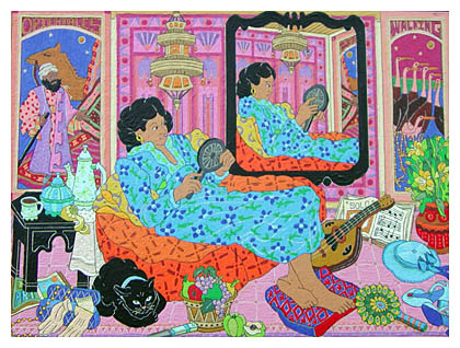 Title: Woman in Interior with Cat Medium: Acrylic with Mixed Media on Wood Frame: Painted Frame Size: 45" by 33" Price: $1,850.00