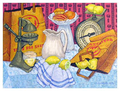 Title: Still Life With Bags and Lemons Medium: Acrylic on Canvas Frame: Unframed Size: 22" by 24" Price: $800.00