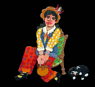 Title: Woman in Chair with Cat and Purse Medium: Layered Wood Acrylic with Mixed Media Size: 32" by 20" Cat 12" by 8" Price: $875.00 Figure $150.00 Cat